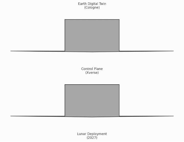 This diagram shows the vital role of the Earth-based digital twin for initial testing and validation, overseen by a central control platform (like FusionLayer's Xverse) that ultimately manages the smooth transition and continuous operation of infrastructure on the Moon.